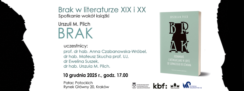 Serdecznie zapraszamy na spotkanie dotyczące książki Urszuli M. Pilch Brak. Doznawanie i doświadczanie w liryce od Słowackiego do Leśmiana. Rozmowa o książce stanie się pretekstem do rozważań nad kulturową ciągłością XIX i XX wieku, ciągłością dostrzegalną we wrażliwości na poczucie niepełni, grozę wybrakowanego uniwersum. Poezja Słowackiego, Asnyka, Tetmajera, Staffa, Ostrowskiej, Leśmiana i innych okazuje się zapisem doznania braku, przekładania i niemożności przełożenia owego braku na wyobrażenia, uczucia, postawy, strategie.
